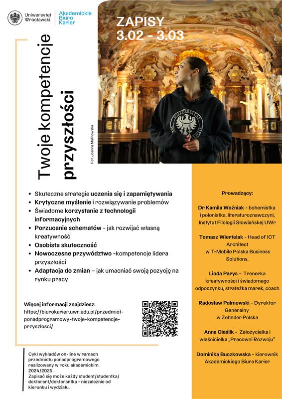 Akademickie Biuro Karier zaprasza na nowy przedmiot ponadprogramowy – „Twoje Kompetencje Przyszłości”. Nazwa nie jest przypadkowa – zajęcia skoncentrowane są na kompetencjach, które już teraz stanowią przewagę kandydatów na rynku pracy, a w przyszłości mogą stać się niezbędne w każdej branży. Kompetencje te są uniwersalne, cenione przez pracodawców i przydatne niezależnie od stanowiska czy formy zatrudnienia.